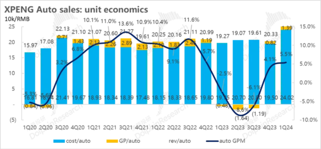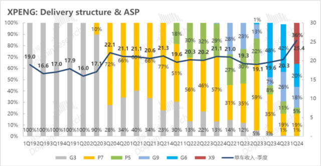价的方面,由于小鹏现有车型中定价最高的纯电MPV X9(定价35.98-41.98万)在销售结构中占比达到36%,拉高了一季度的单价,最后一季度单价环比上行5万。
