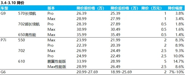 虽然小鹏由于销售淡季+竞争加剧,在3月份又开始了新一轮降价,对P7i降价2万元-5万元(降幅8-15%),G6全系降价2万元(降幅7-10%),G9降价0.5-1万元(降幅1.4%-4%),但降价主要从3月开启,影响只部分计入到一季度销售中。