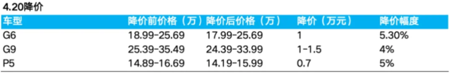 而二季度的单价下行由于3月降价的影响将会直接带入到二季度,同时4.20由于竞争加剧,销量的的持续疲软又开始对旗下G6/G9/P5新一轮降价0.7-1.5万元,降价幅度4%-5%,负面影响了二季度的单价。